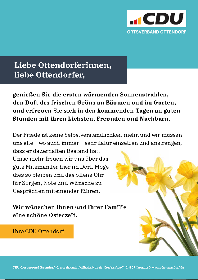 genießen Sie die ersten wärmenden Sonnenstrahlen, den Duft des frischen Grüns an Bäumen und im Garten, und erfreuen Sie sich in den kommenden Tagen an guten Stunden mit ihren Liebsten, Freunden und Nachbarn.