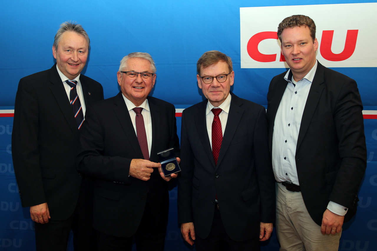 Er unterstützt die CDU jedoch nicht nur durch seine zahlreichen Veranstaltungen in seiner Heimatgemeinde, sondern ist auch immer Triebfeder für unseren Kreisverband. Mit vielen Ideen und auch tatkräftiger Unterstützung ist "Willi" immer ansprechbar für die Mitglieder der CDU aber auch den Vorstand. Aus diesem Grunde haben der Kreisvorsitzende Dr. Johann Wadephul, der Fraktionsvorsitzende Tim Albrecht und der örtliche Landtagsabgeordnete Hauke Göttsch Wilhelm Blöcker auf dem Jahresempfang der CDU Flintbek die Dankmedaille überreicht.