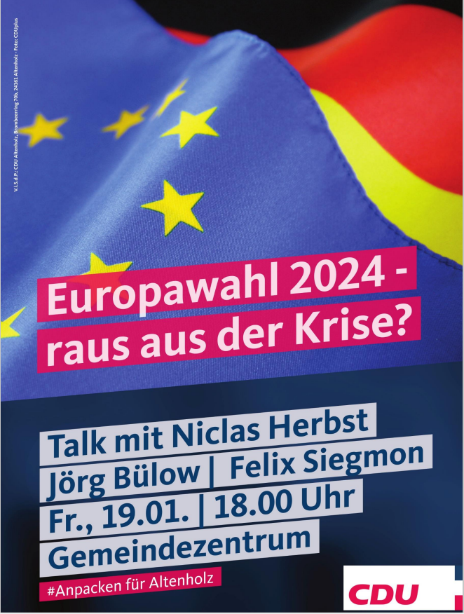 am Freitag, den 19. Januar ab 18:00 Uhr eröffnen wir in Altenholz das Europawahljahr 2024 mit einer Podiumsdiskussion im Gemeindezentrum.