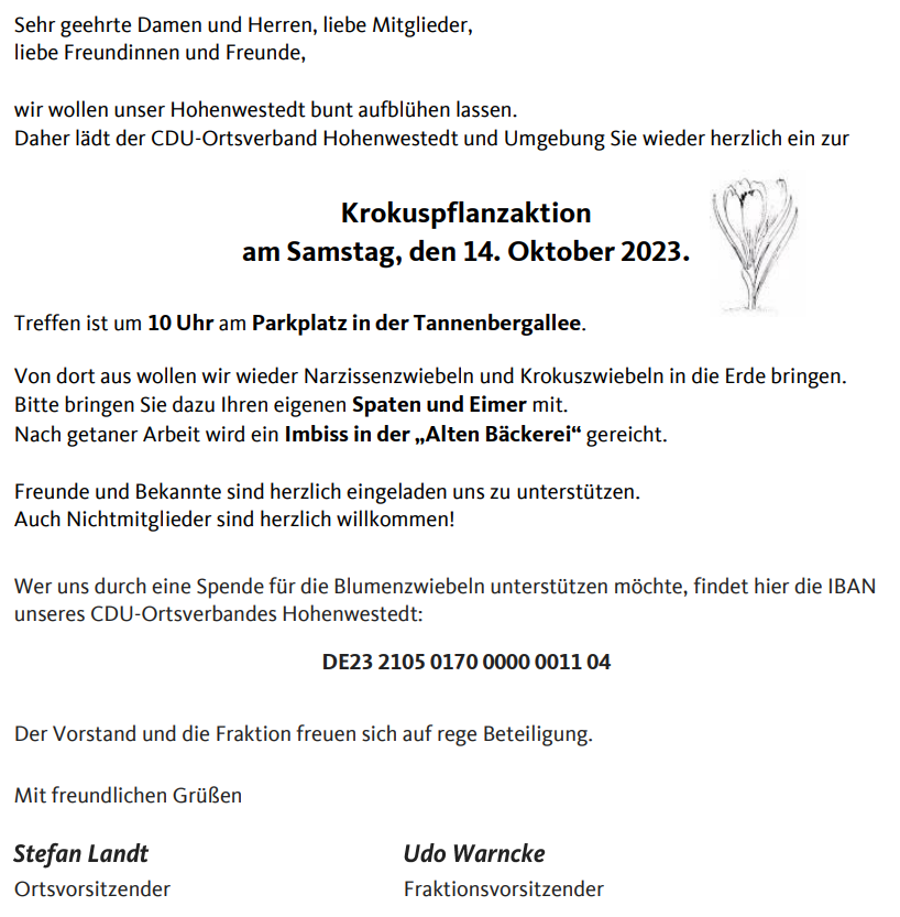 Die CDU Hohenwestedt und Umgebung lädt ein zur Krokuspflanzaktion.